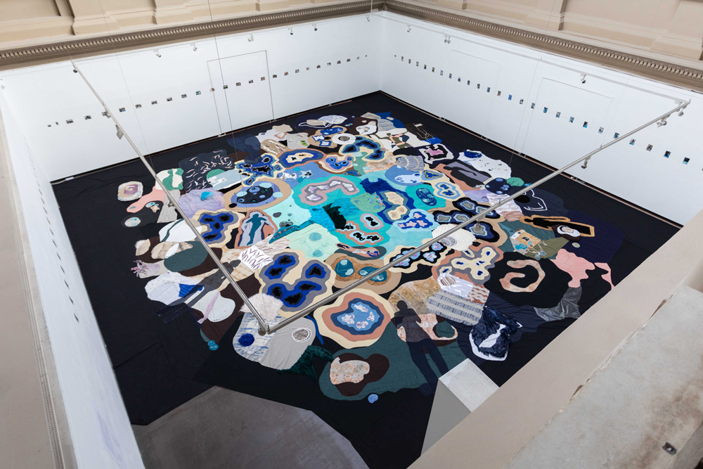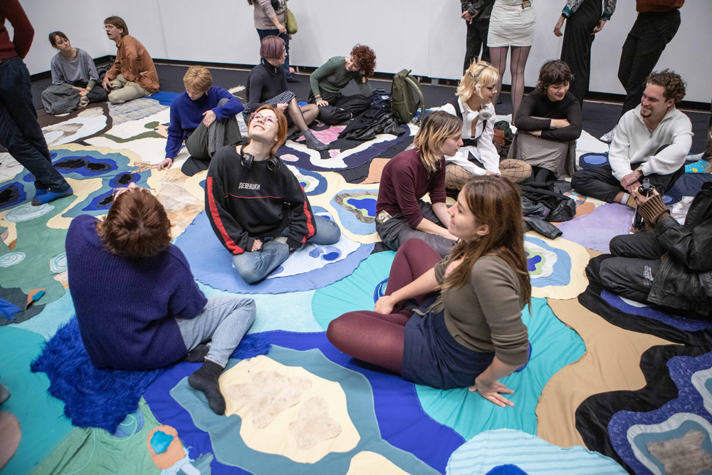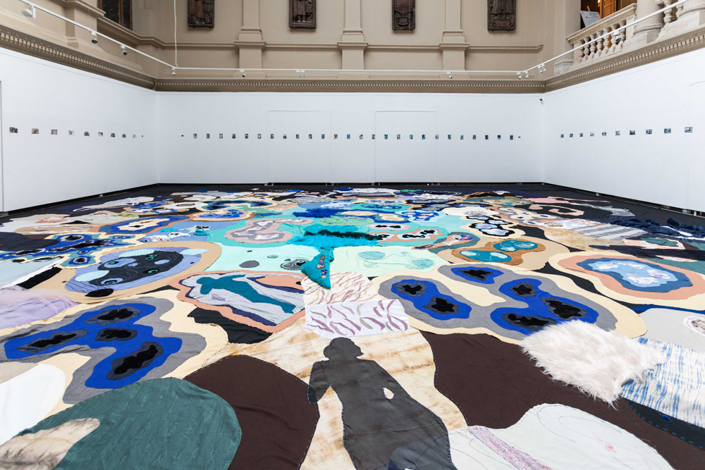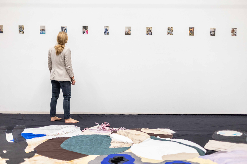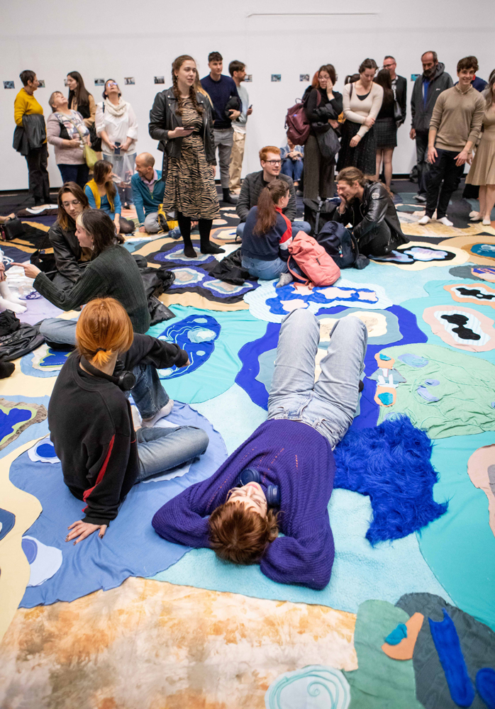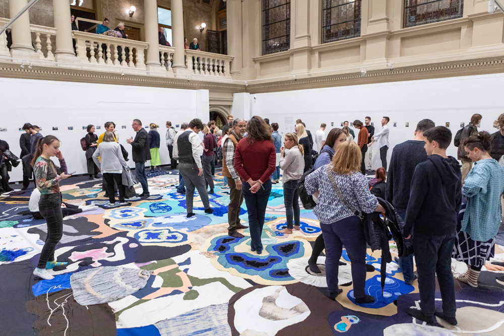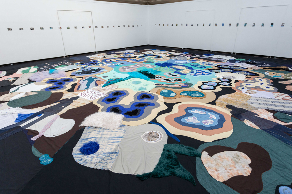 A Mikrotópiák és Makrotópiák című installáció helyspecifikus műként valósult meg a Magyar Képzőművészeti Egyetem Aulájában, melynek központi eleme az egyetemi aula padlózatát teljesen beborító, kollektíven létrehozott textilstruktúra volt. Az előre kiszabott mintázatok három napon át tartó, helyszíni összevarrása nemcsak a mű megalkotásának technikai mozzanata volt, hanem performatív aktusként is működött – láthatóvá téve a műtárgy létrehozásának folyamatát egy olyan térben, ahol a néző rendszerint csak a végső művet látja.